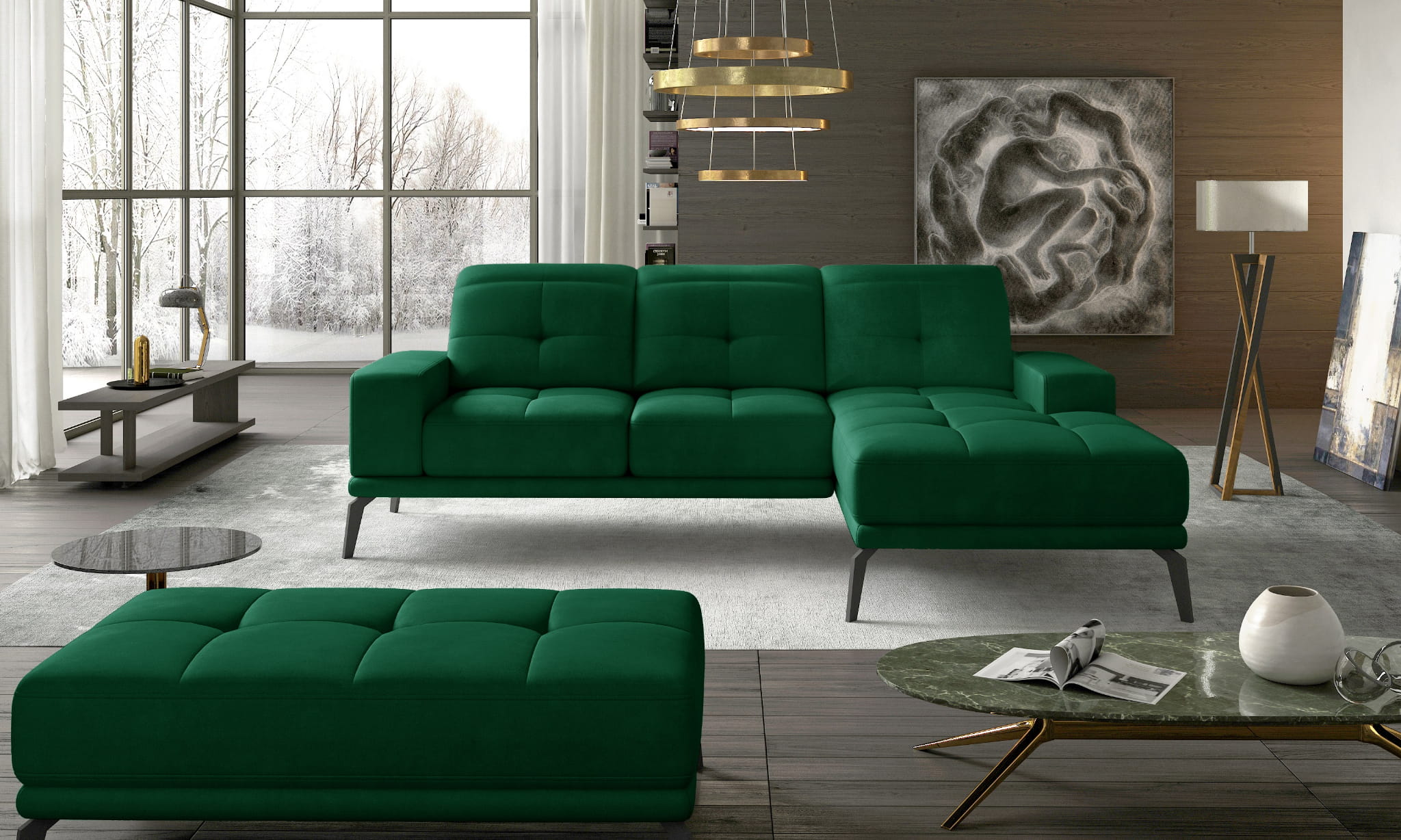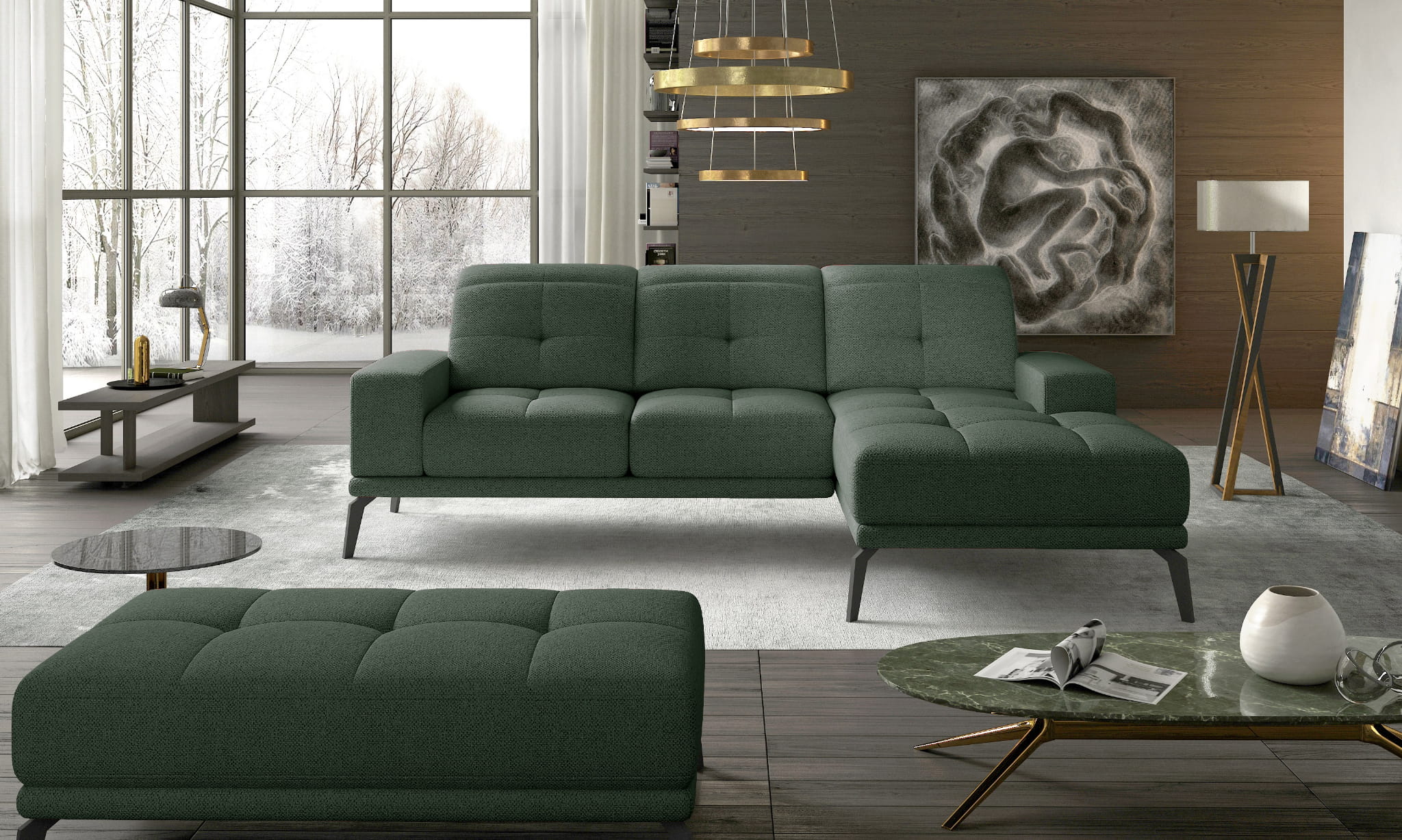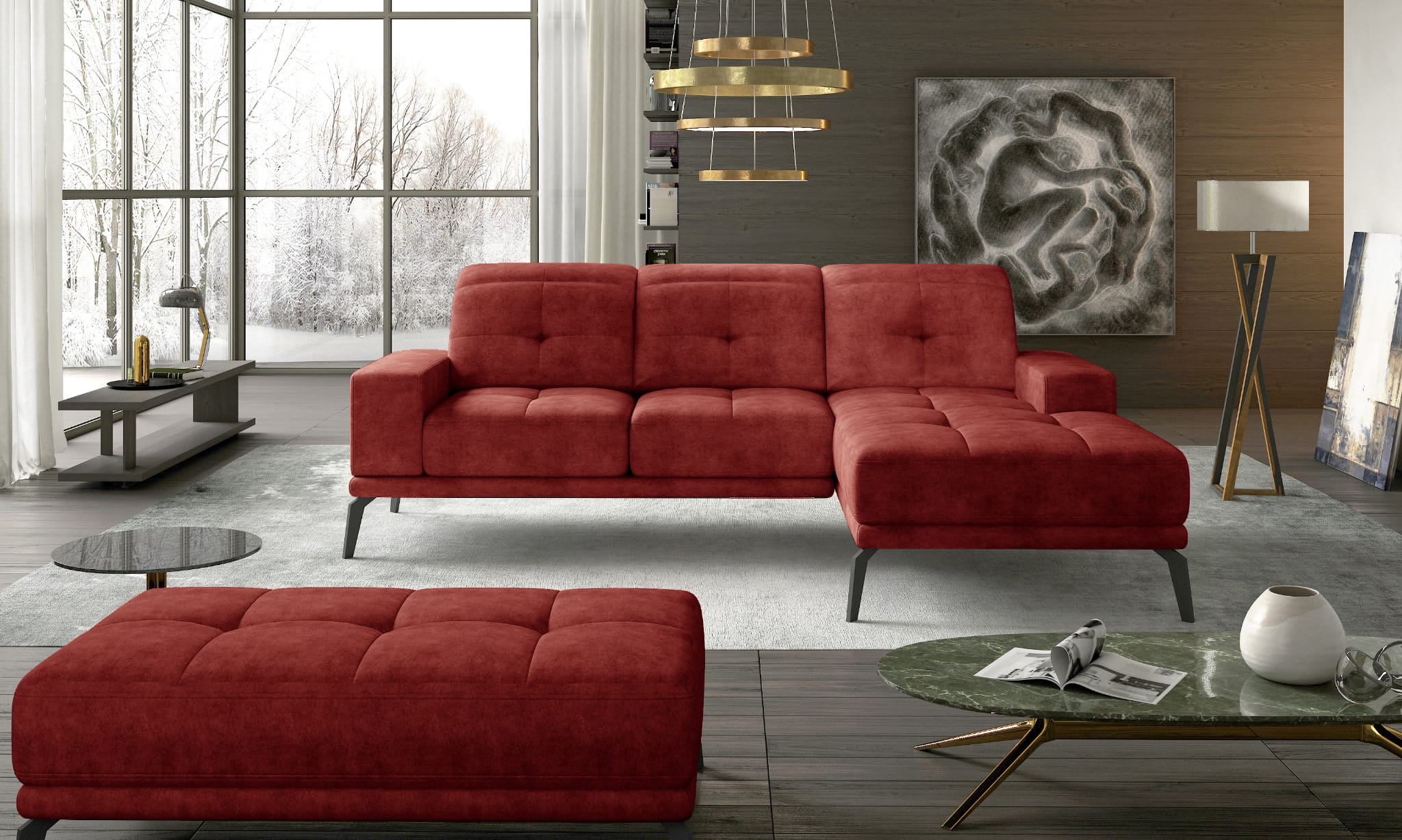 Narożnik Torrense to nowoczesne połączenie narożnika z wielofunkcyjną pufą, która może posłużyć zarówno jako dodatkowe miejsce do siedzenia, podnóżek jak i stolik na tacę z kawą i herbatą. To model, który wprowadza w nasze wnętrza odrobinę luksusu. Wysokie, cienkie, czarne, metalowe nóżki sprawiają, że duża konstrukcja siedziska staje się lekka, nie tracąc nic na swojej stabilności. Torrense to narożnik, w którym zastosowano wiele innowacyjnych rozwiązań: długa otomana, która pozwala na swobodne rozprostowanie nóg, dwa szerokie podłokietniki, przesuwane oparcia oraz regulowane zagłówki. Wszystko to sprawia, że narożnik Torrense jest stworzony, aby zapewniać idealny wypoczynek - wykorzystaj pufę jako dodatkowe miejsce do siedzenia, gdy przyjdą goście lub dosuń do narożnika i ciesz się dużą powierzchnią spania. Delikatne pikowania na siedzisku i oparciu to detale, które sprawiają, że całość nabiera eleganckiego wymiaru. Zestaw narożnik z pufą dostępny jest w ponad 30 wariantach kolorystycznych, w zarówno energetycznych, jak i stonowanych kolorach.