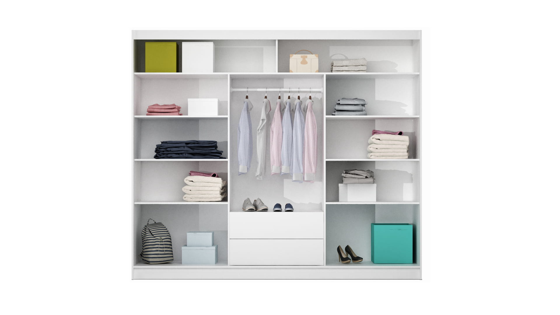 Wyposażenie: aluminiowe prowadnice, dolne wózki na łożyskach, 1 drążek, półki, 2 szuflady