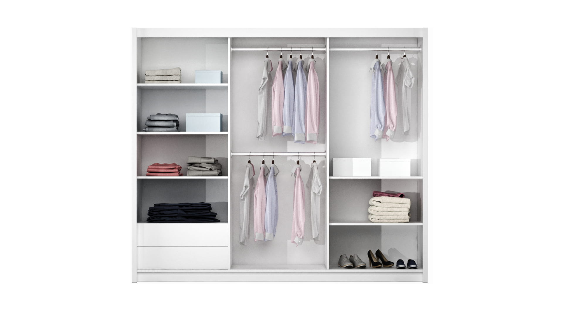 Wyposażenie: drzwi podwieszane na okuciach firmy HÄFELE, 3 drążki, półki, 2 szuflady