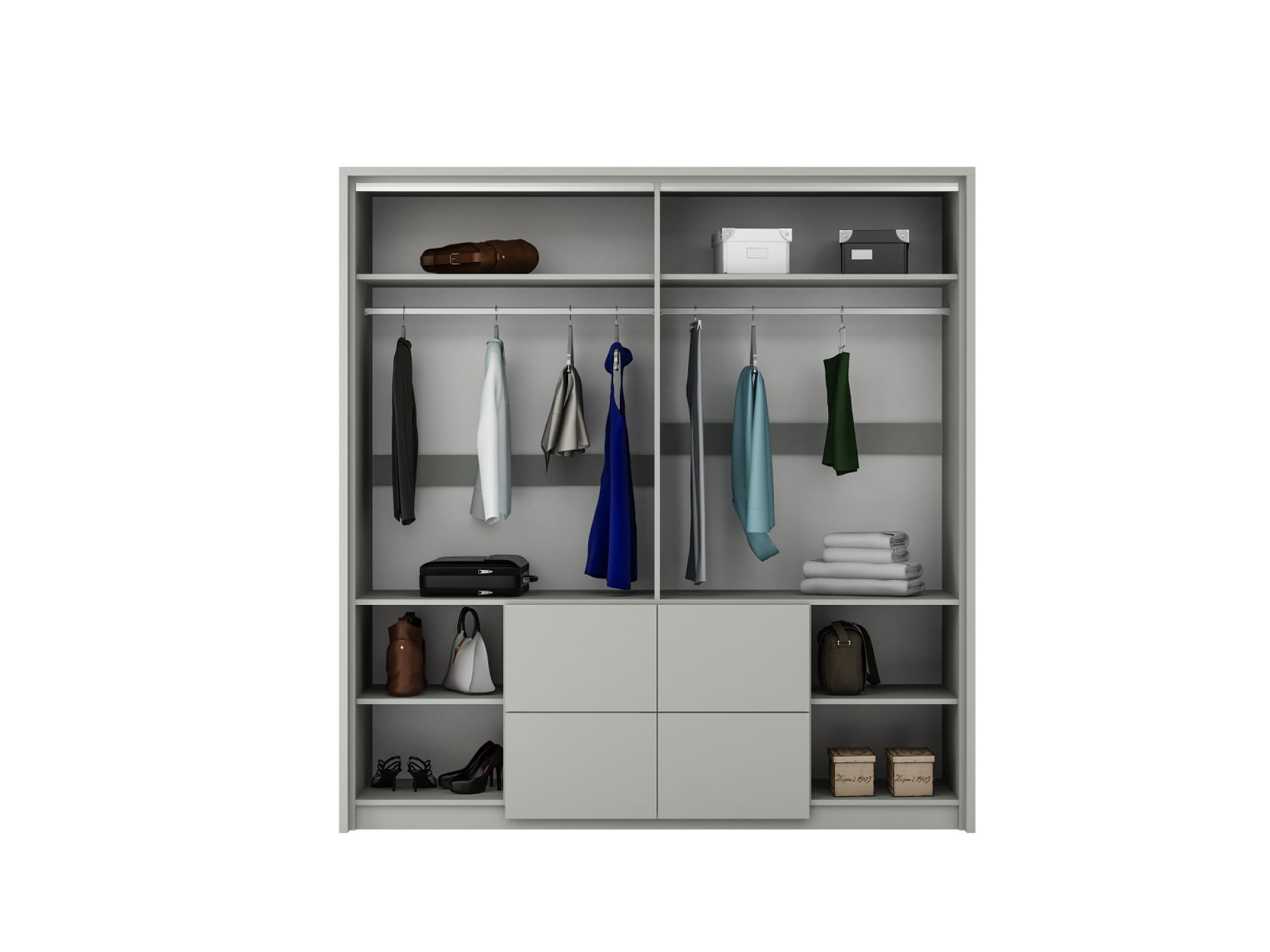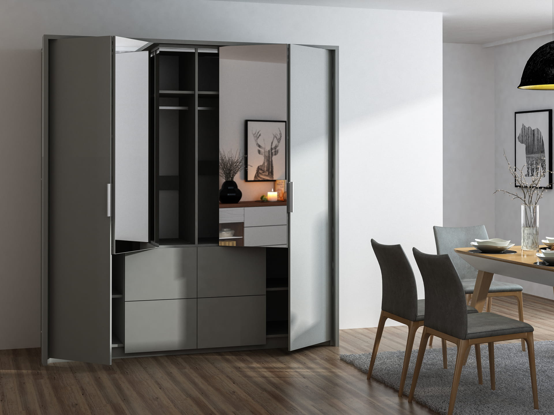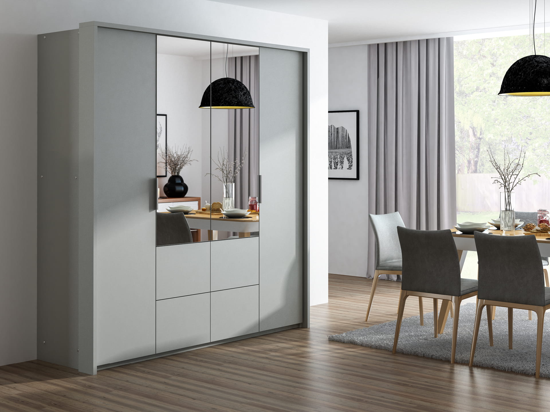 Wyposażenie: drzwi podwieszane na okuciach firmy HETTICH, 2 drążki, lustro, 4 szuflady, półki