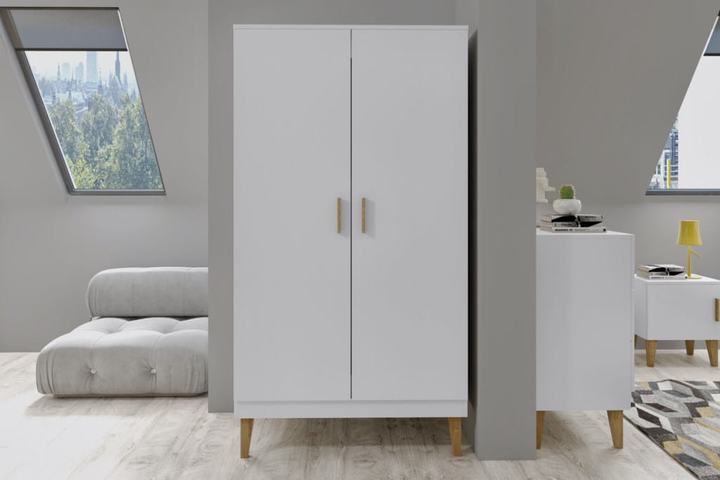 Nowoczesna szafa KUBI na drewnianych dębowych nogach podkreślających skandynawski styl, sprawdzi się idealnie we współczesnych
