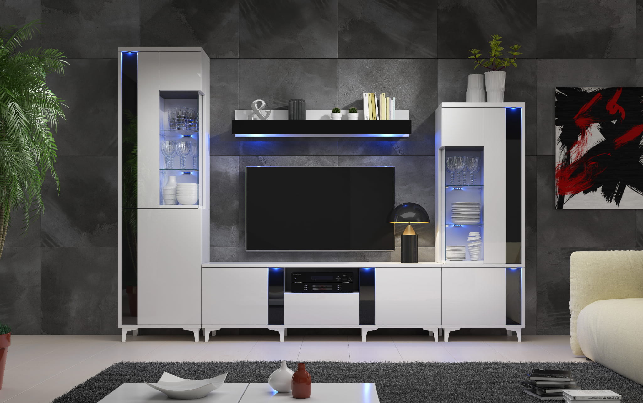 korpus: biały mat, fronty: biały połysk, wstawka: czarny połysk